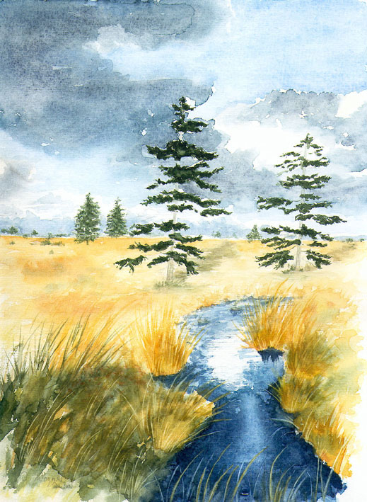 Flusslandschaft mit Tannen